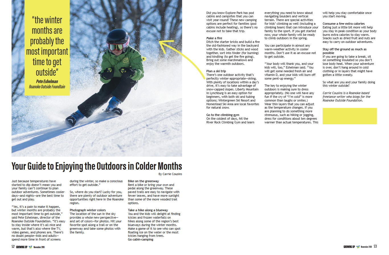 Article or Growing Up in the Valley magazine about things to do and activities that families can participate in outdoors in the winter months.